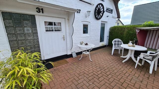Das Appartement Nummer 31 ist ca. 35 qm groß und aufgeteilt in: * ein kleines Wohnzimmer mit Couch, Sessel und 40 Zoll TV * Schlafzimmer mit franz. Bett (140x200), Schrank und Sessel * 70th Saloon mit Küchenzeile, Kaffeemaschine, Wasserkocher, Tisch und 2 Stühle * 70th Badezimmer mit Dusche, Waschbecken und WC * Es liegt im Erdgeschoss und verfügt über eine möblierte Terrasse mit Strandkorb * Wir möchten auf die niedrige Deckenhöhe in dem nostalgischen Reetdachhaus hinweisen.